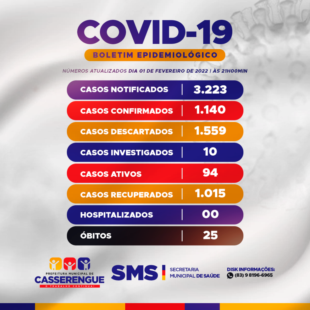 BOLETIM COVID-19 em 01 de fevereiro de 2022 às 21h00min.