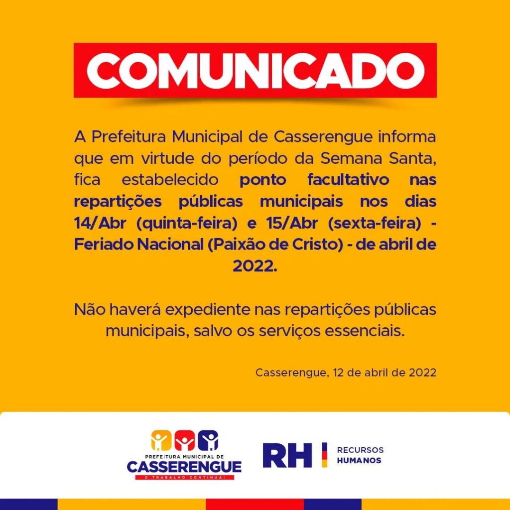 A Prefeitura Municipal de Casserengue informa que em virtude do período da Semana Santa, fica estabelecido ponto facultativo nas repartições públicas municipais nos dias 14/Abr (quinta-feira) e 15/Abr (sexta-feira) - Feriado Nacional (Paixão de Cristo) - de abril de 2022.