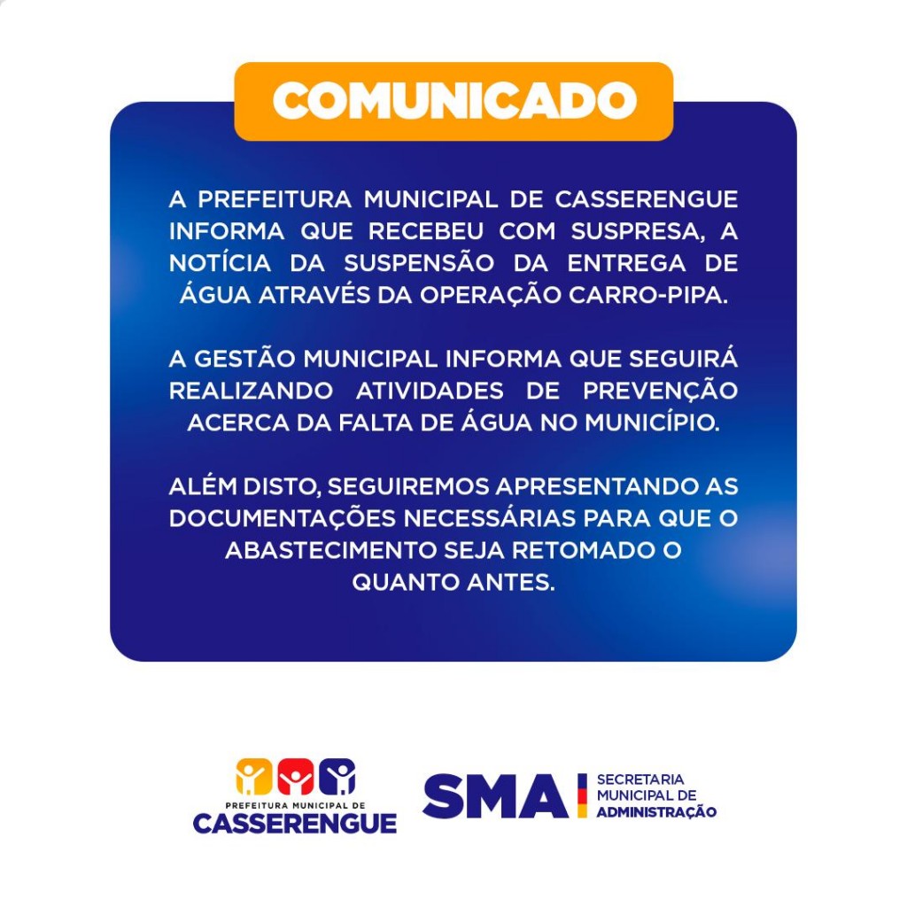 A Prefeitura Municipal de Casserengue informa que recebeu com suspresa, a notícia da suspensão da entrega de água através da Operação Carro-Pipa.