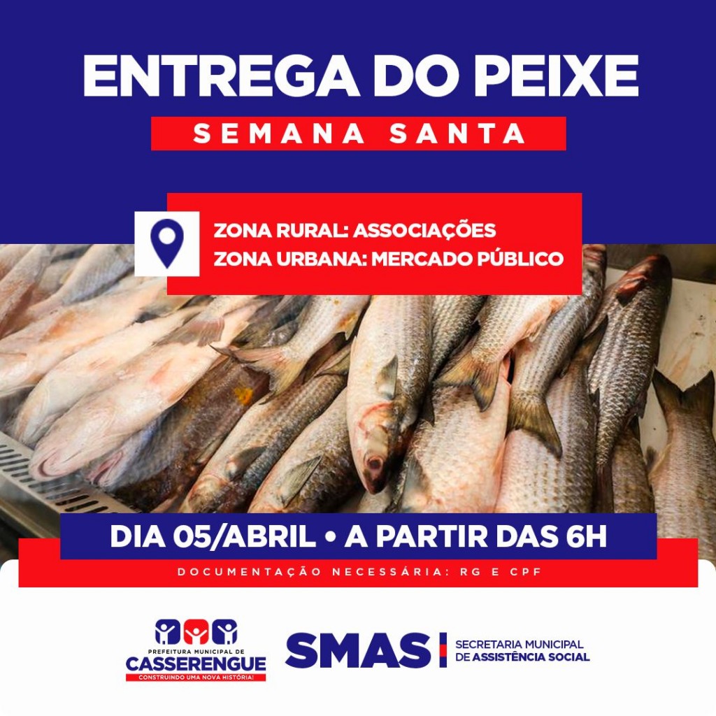 Nesta quarta-feira, 05/Abril, a Prefeitura Municipal de Casserengue, através da Secretaria de Assistência Social (SMAS), realizará a entrega do tradicional peixe da Semana Santa às famílias casserenguenses.