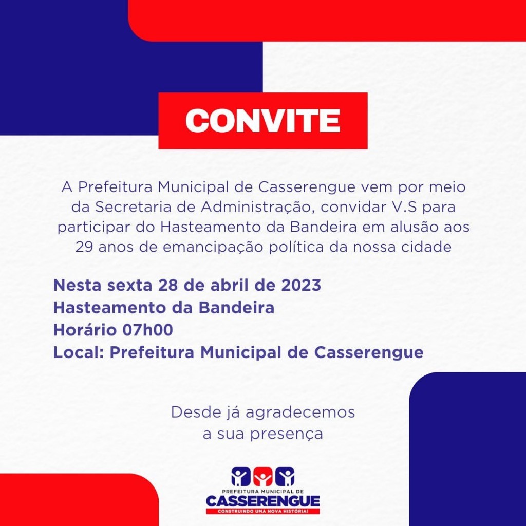 A Prefeitura Municipal de Casserengue vem por meio da Secretaria de Administração, convidar V.S para participar do Hasteamento da Bandeira em alusão aos