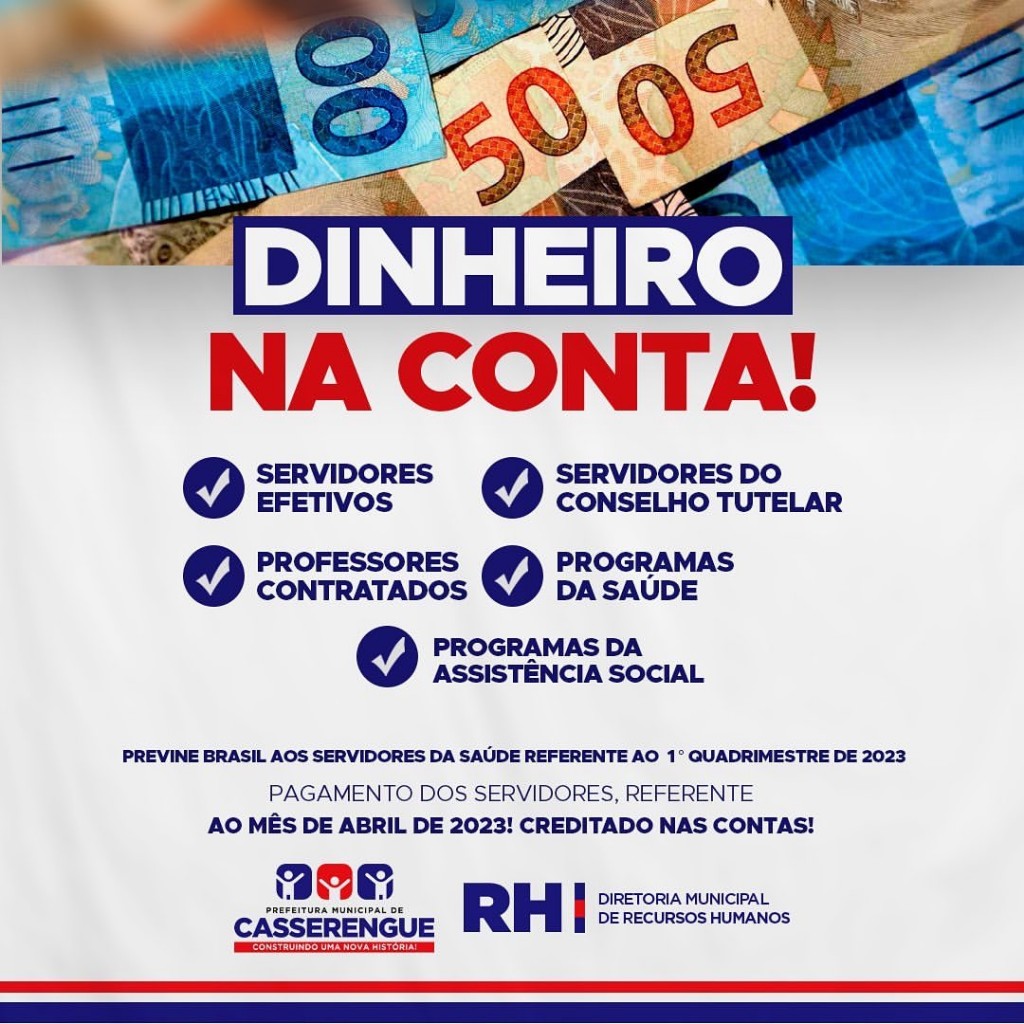 A Prefeitura de Casserengue por meio da Diretoria de Recursos Humanos informa que o pagamento alusivo ao mês de Abril de 2023 já está disponível em conta para retirada.