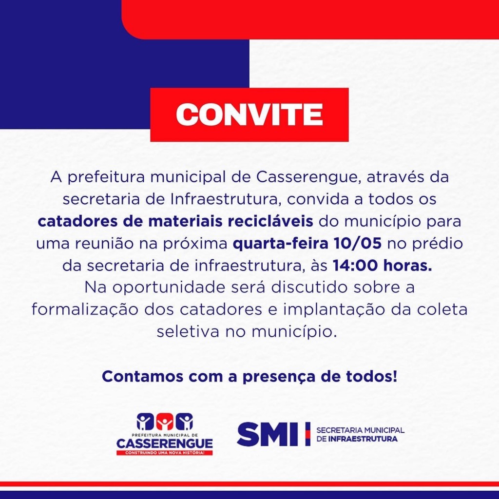 A prefeitura municipal de Casserengue, através da secretaria de Infraestrutura, convida a todos os catadores de materiais recicláveis do município para uma reunião na próxima quarta-feira 10/05 no prédio da secretaria de infraestrutura, às 14:00 horas.
