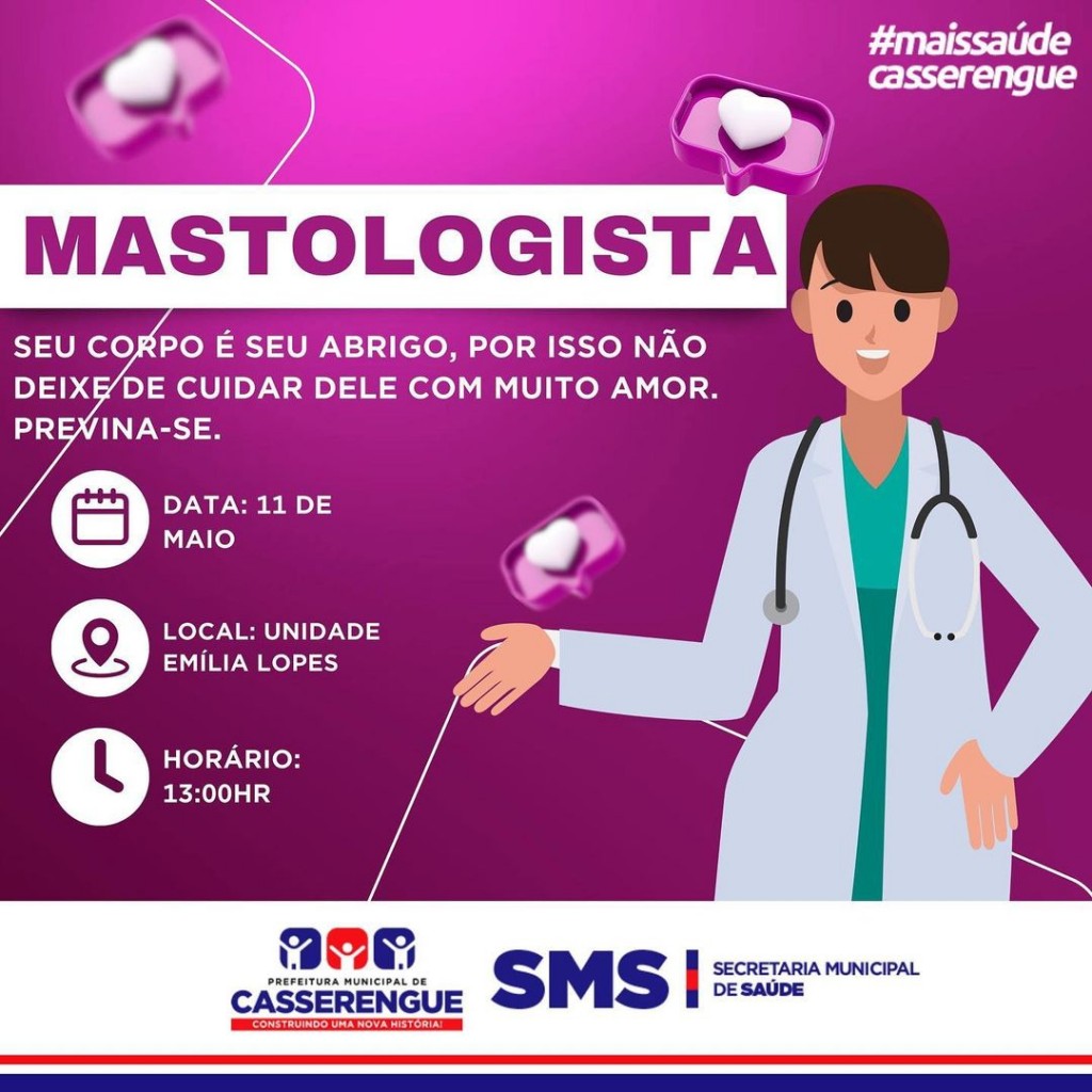 A secretaria municipal de saúde, juntamente com a prefeitura municipal informa que nessa quinta-feira 11 de maio, teremos atendimento com a Mastologista às 13h00 na unidade Emília Lopes.