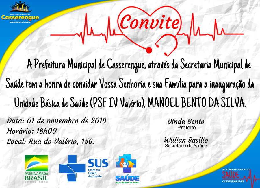 A Prefeitura Municipal de Casserengue, através da Secretaria Municipal de Saúde tem a honra de convidar Vossa Senhoria e sua Família para a inauguração da Unidade Básica de Saúde (PSF IV Valério), MANOEL BENTO DA SILVA.