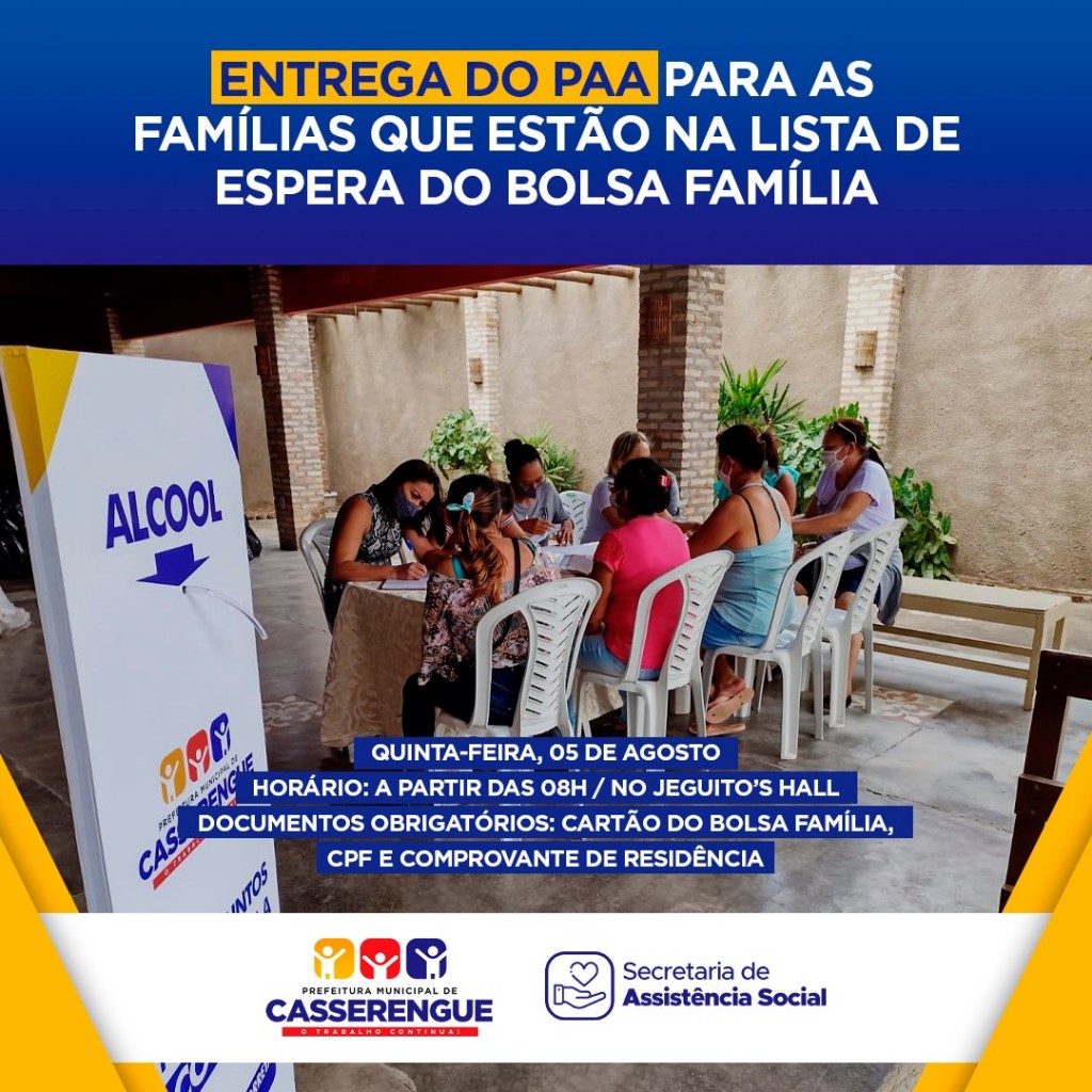 A Secretaria Municipal de Assistência Social realizará nesta quinta-feira (05/08), em parceria com o Governo Estadual e a Secretaria Executiva de Segurança Alimentar e Economia - Solidária vinculada a - SEDH - a entrega do PAA - Programa de Aquisição de Alimentos.