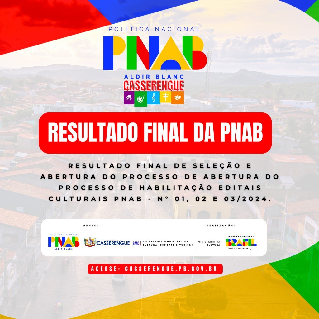 Link do documento oficial com o resultado final: RESULTADO FINAL E ABERTURA DO PROCESSO DE HABILITAÇÃO EDITAIS CULTURAIS PNAB N° 01, 02 E 03/2024 | POLITICA NACIONAL ALDIR BLANC - PNAB CASSERENGUE/PB - Prefeitura Municipal de Casserengue