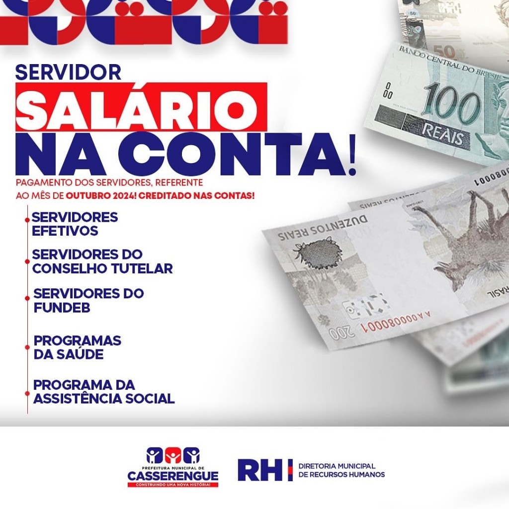 Informamos que o pagamento referente ao mês de outubro de 2024 já foi creditado nas contas dos servidores. 🎉