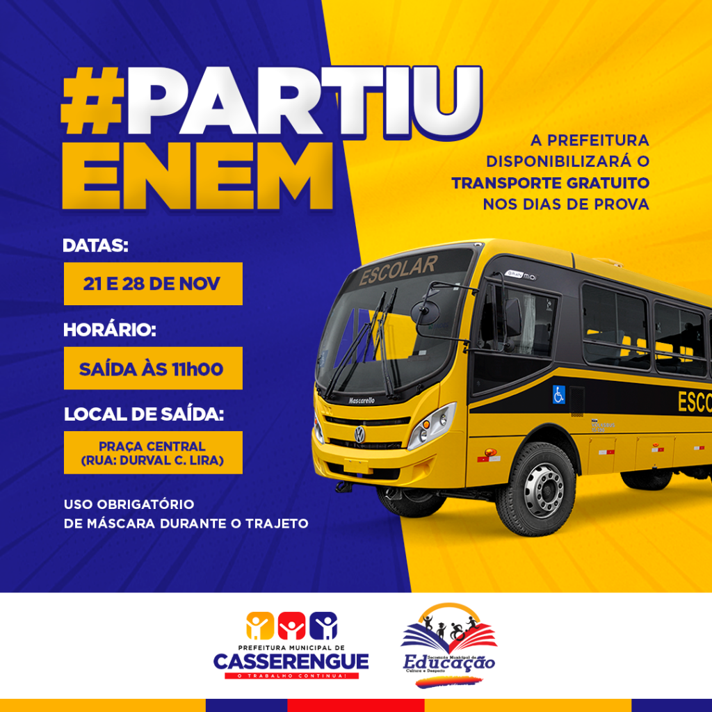 A Prefeitura de Casserengue por meio da Secretaria de Educação, com o objetivo de garantir o acesso dos estudantes para a realização do Ensino Nacional do Exame Médio (Enem), que acontecerá nos dias 21 e 28 de novembro, disponibilizará ônibus gratuitamente aos alunos para realização das provas na cidade de Solânea.