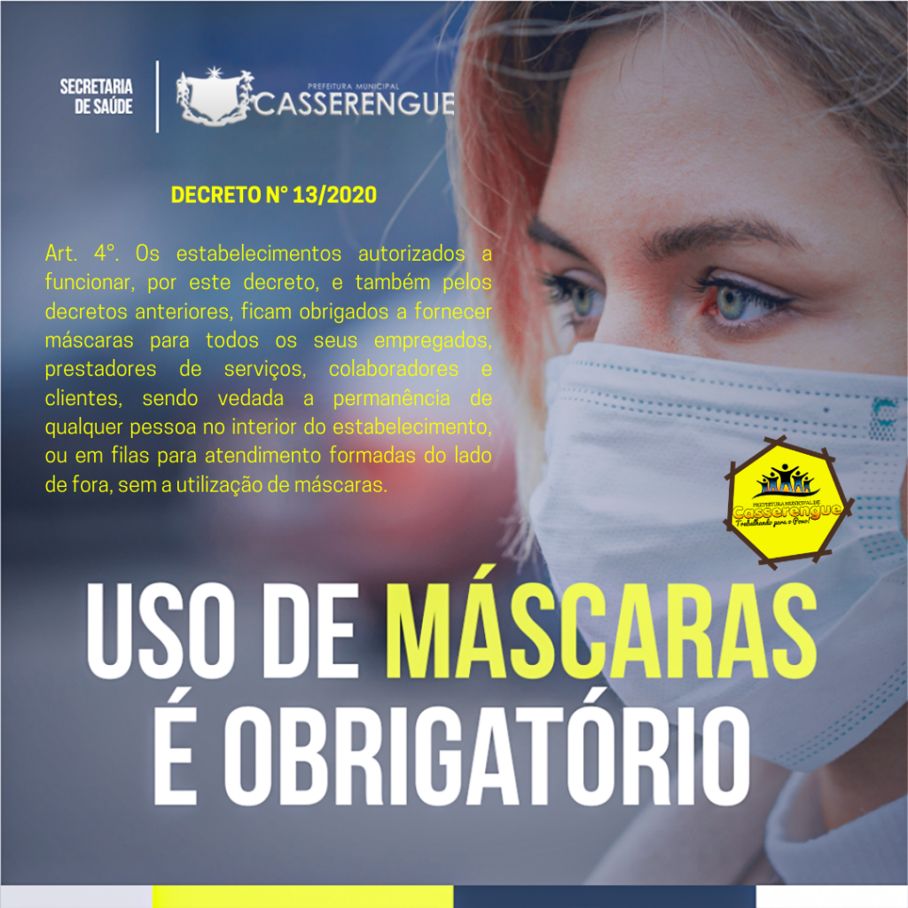 A partir de agora é obrigatório o uso de máscara de proteção respiratória em Casserengue. Deverão utilizar todos trabalhadores que exerçam suas atividades em ambientes públicos ou de livre acesso no município, somente dispensável em residências ou em locais públicos ou privados onde somente uma pessoa utilize ou trabalhe.