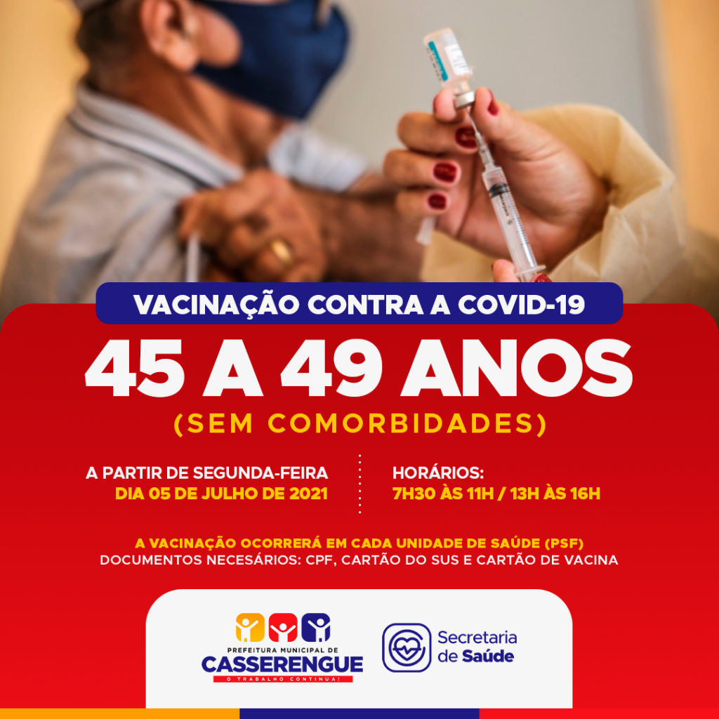 Hoje (05), iniciaremos a vacinação das pessoas entre 45 e 49 anos sem comorbidades. A vacinação ocorrerá em todas as unidades de saúde do município de forma simultânea.