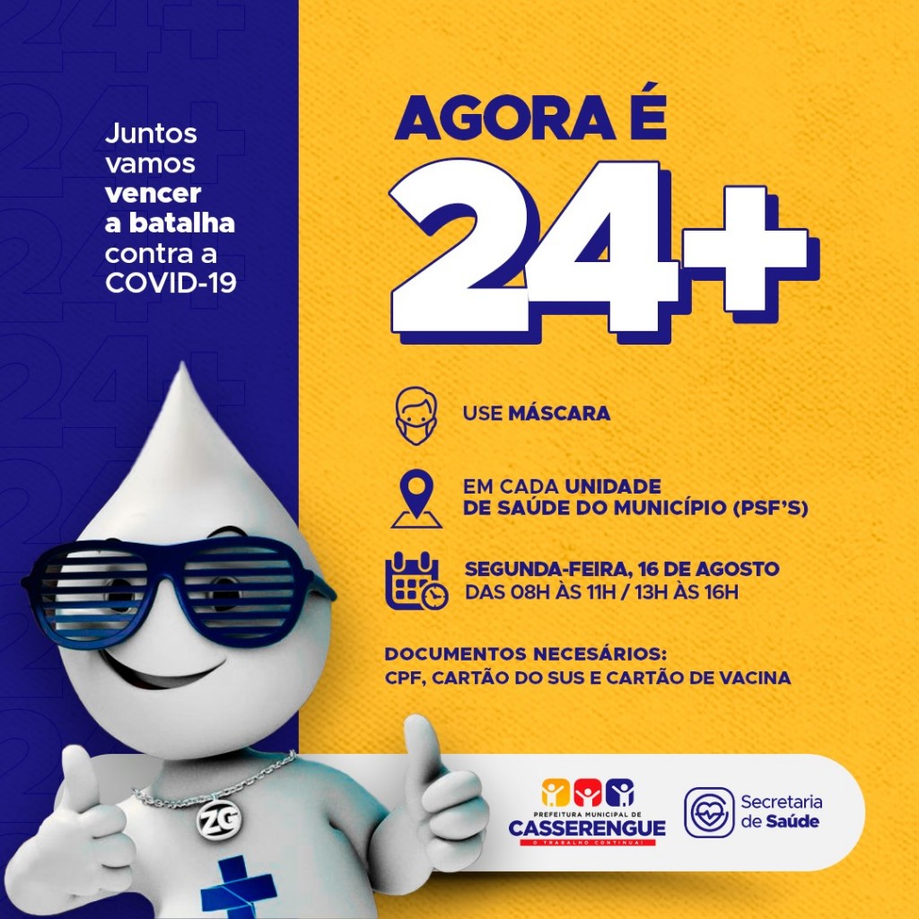 A partir desta Segunda-feira (16/Ago), iniciaremos a vacinação das pessoas com 24 anos - sem comorbidades. 🦯💛