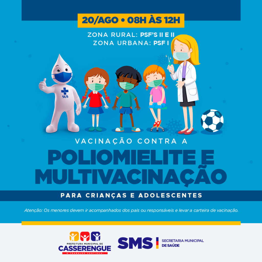 A Campanha Nacional contra Poliomielite e Multivacinação será realizada neste sábado, 20 de agosto de 2022 das 08h às 12h.