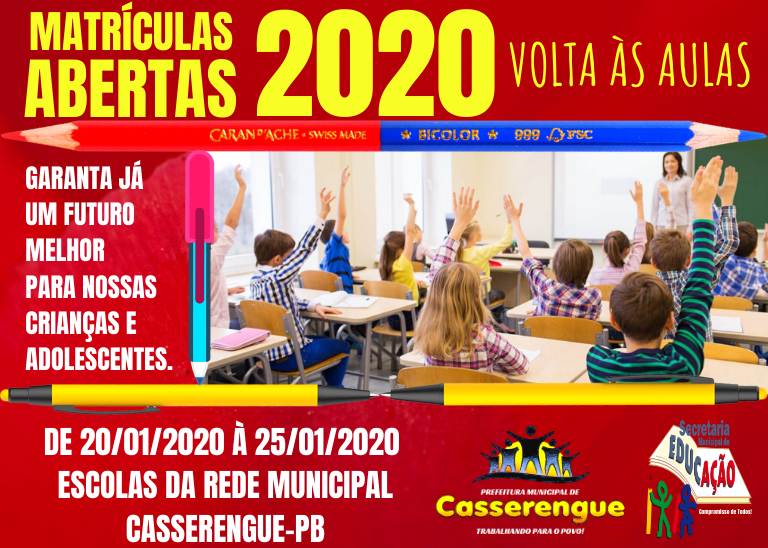 MATRÍCULAS ABERTAS DE 20/01/2020 À 25/01/2020 - ESCOLAS DA REDE MUNICIPAL CASSERENGUE-PB.