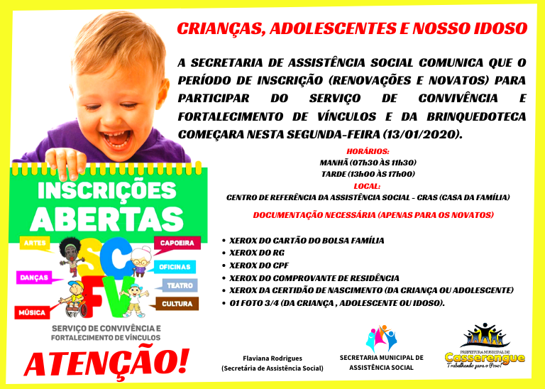 A SECRETARIA DE ASSISTÊNCIA SOCIAL COMUNICA QUE O PERÍODO DE INSCRIÇÃO (RENOVAÇÕES E NOVATOS) PARA PARTICIPAR DO SERVIÇO DE CONVIVÊNCIA E FORTALECIMENTO DE VÍNCULOS E DA BRINQUEDOTECA COMEÇARA NESTA SEGUNDA-FEIRA (13/01/2020).