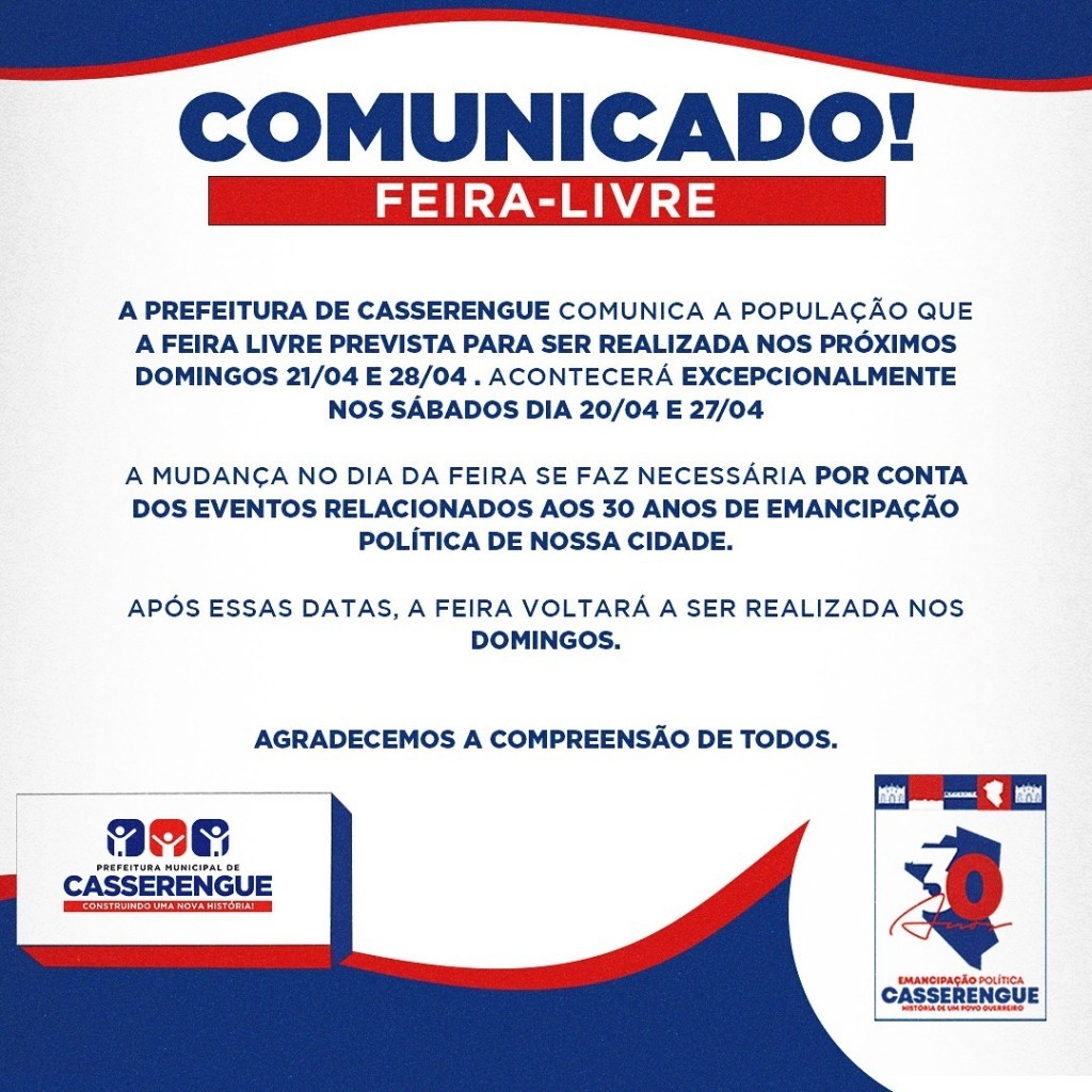 A Prefeitura Municipal de Casserengue comunica a população que a Feira Livre prevista para ser realizada nos próximos domingos 21/04 e 28/04. Acontecerá excepcionalmente nos sábados dias 20/04 e 27/04.
