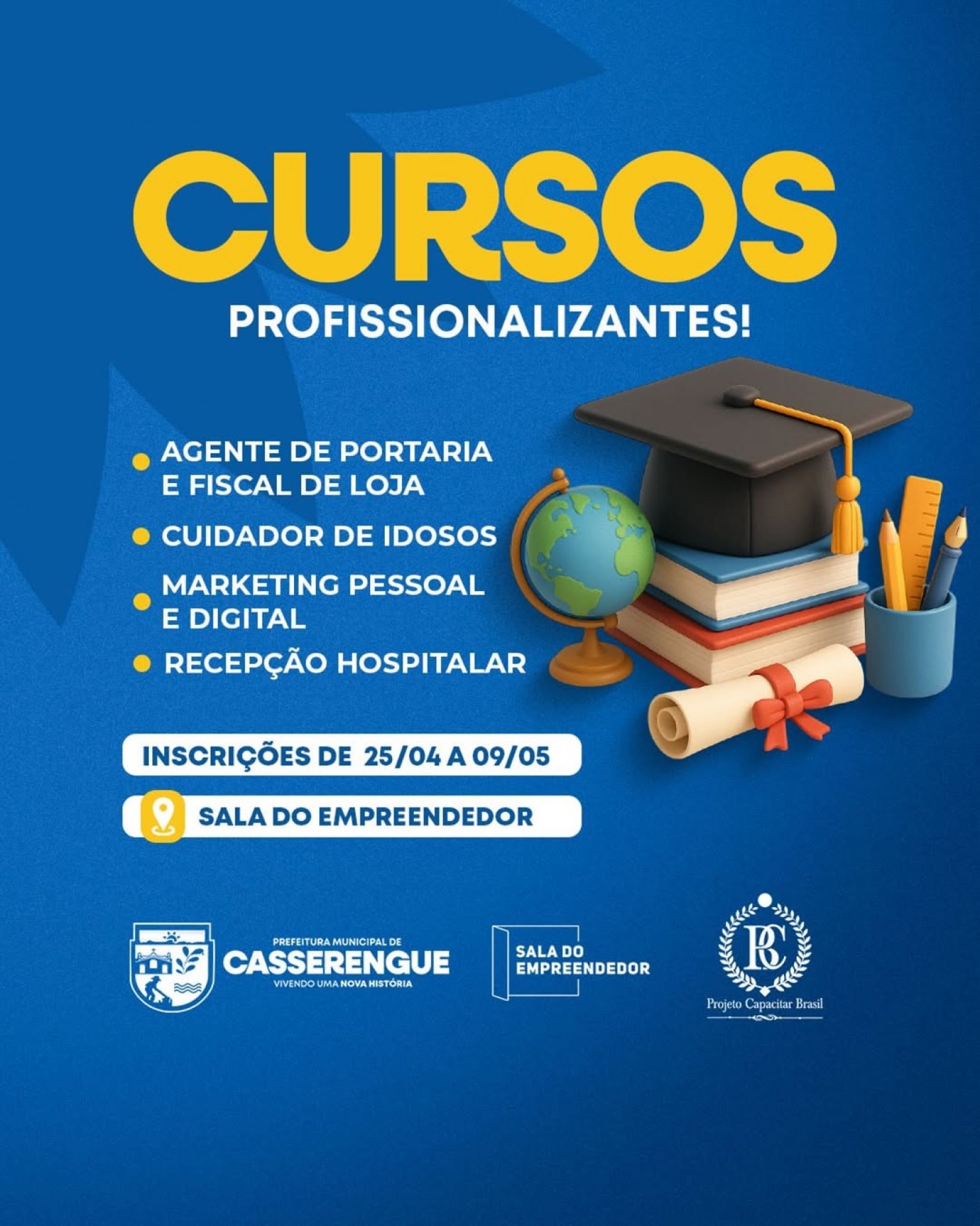 A Prefeitura Municipal de Casserengue, por meio da Sala do Empreendedor, informa que estão abertas as inscrições gratuitas para os seguintes cursos de capacitação profissional: