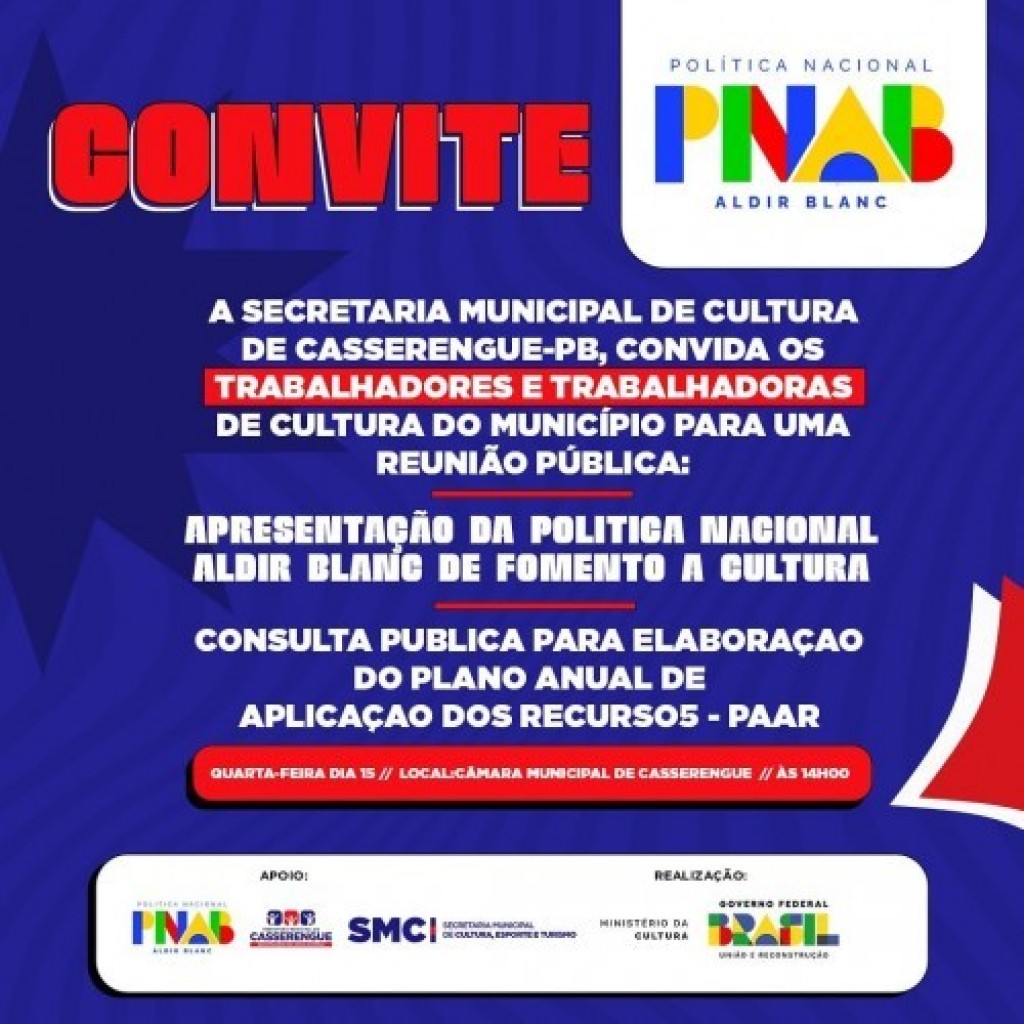 A Secretaria de Cultura da Prefeitura Municipal de Casserengue tem o prazer de convidar todos os profissionais e entusiastas da cultura de nossa cidade para uma reunião pública especial:
