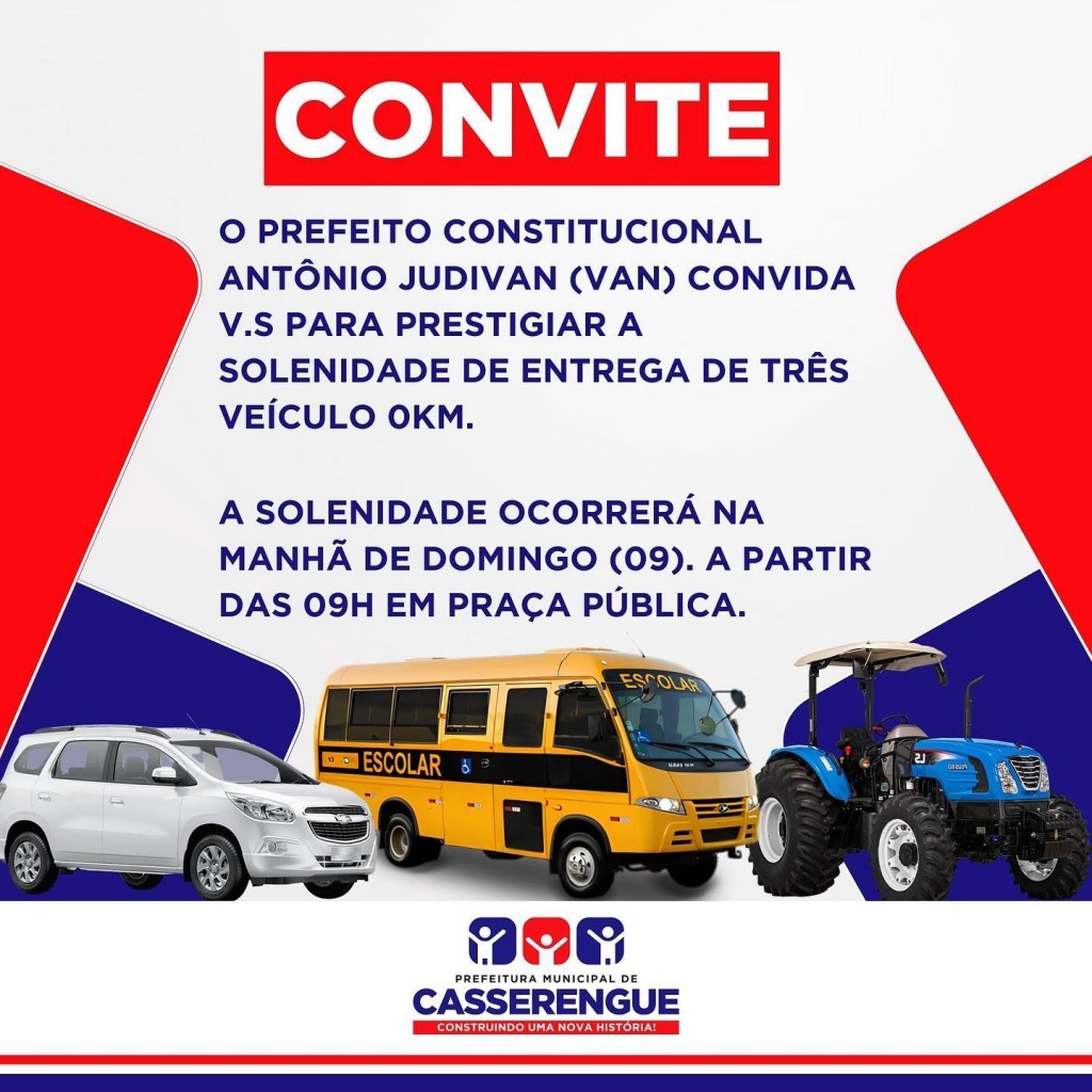 O Prefeito constitucional Antônio Judivan (Van) convida v.s para prestigiar a solenidade de entrega de três veículo 0km.