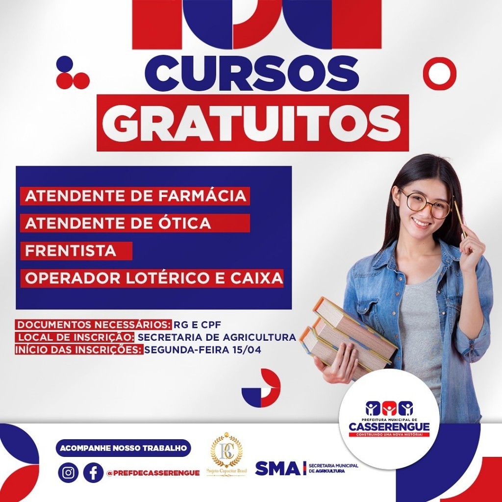 A Prefeitura Municipal de Casserengue, por meio da Secretaria de Agricultura informa que a partir de segunda-feira(15) estarão abertas as inscrições GRATUITAS para os cursos abaixo: