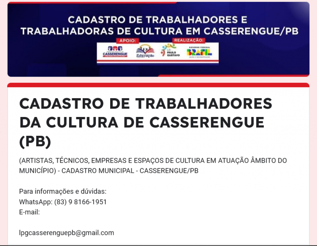 A Prefeitura de Casserengue por meio da Secretaria de Educação e Cultura, informa sobre o Formulário, para a comunidade cultural do município, de Cadastramento referente a Lei Paulo Gustavo.