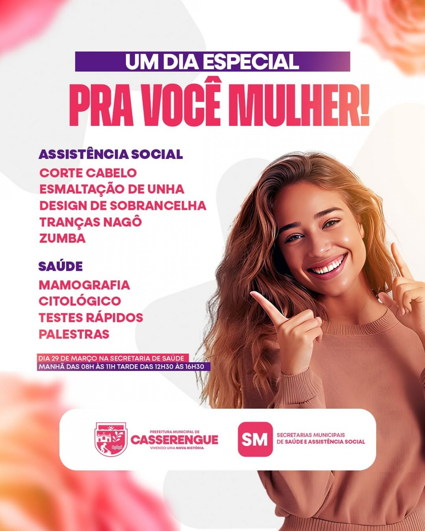 A Prefeitura Municipal de Casserengue, em parceria com as Secretarias de Assistência Social e Saúde, preparou um dia especial para você, mulher! Um momento de cuidado, carinho e serviços exclusivos para valorizar quem sempre cuida de todos.