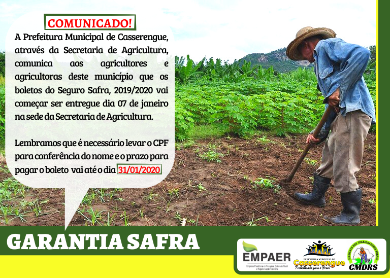 A Prefeitura Municipal de Casserengue, através da Secretaria de Agricultura, comunica aos agricultores e agricultoras deste município que os boletos do Seguro Safra, 2019/2020 vai começar ser entregue dia 07 de janeiro na sede da Secretaria de Agricultura.
