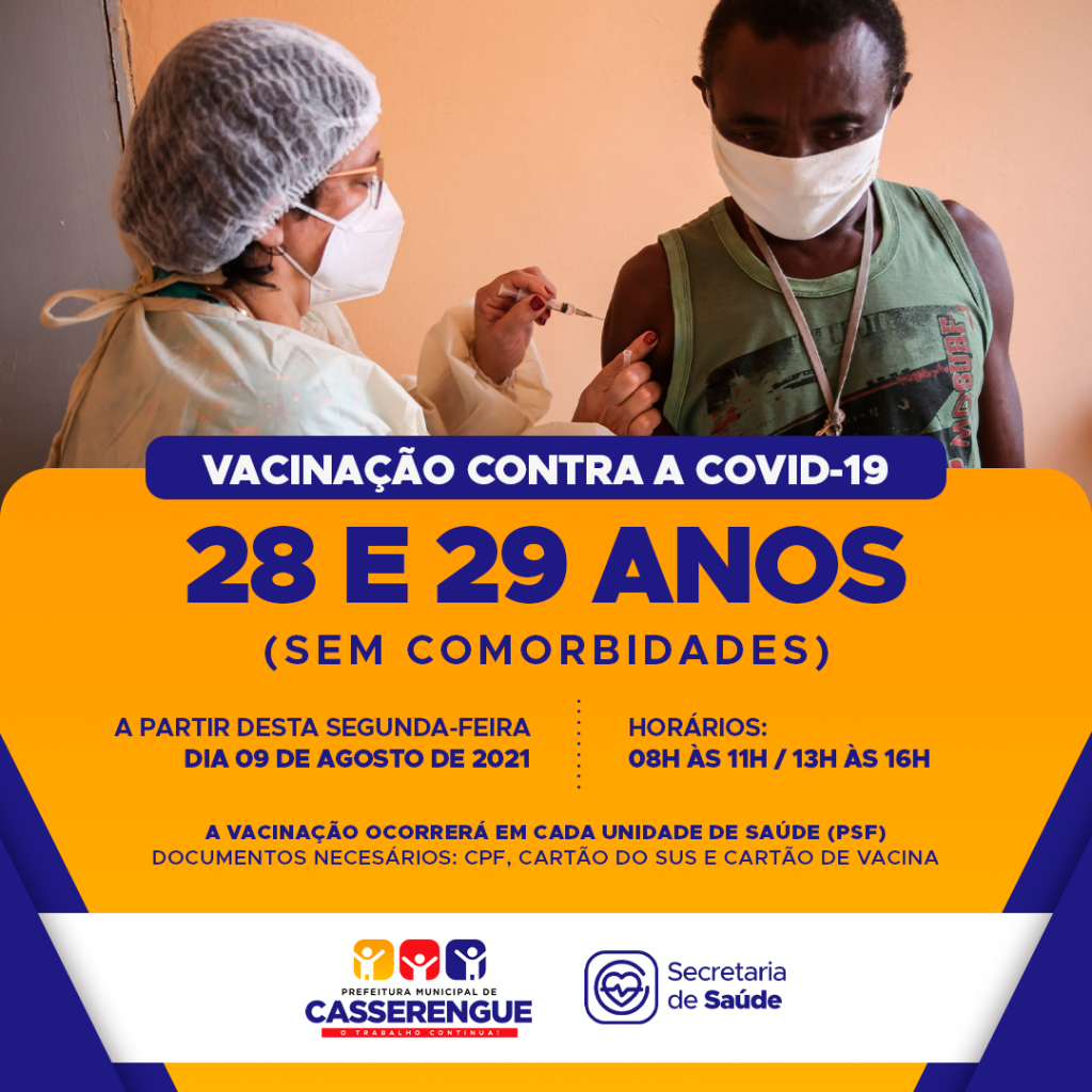 A partir de AMANHÃ (09/08), iniciaremos a vacinação das pessoas com 28 e 29 anos + sem comorbidades. 🦯💛⠀⠀⠀⠀⠀