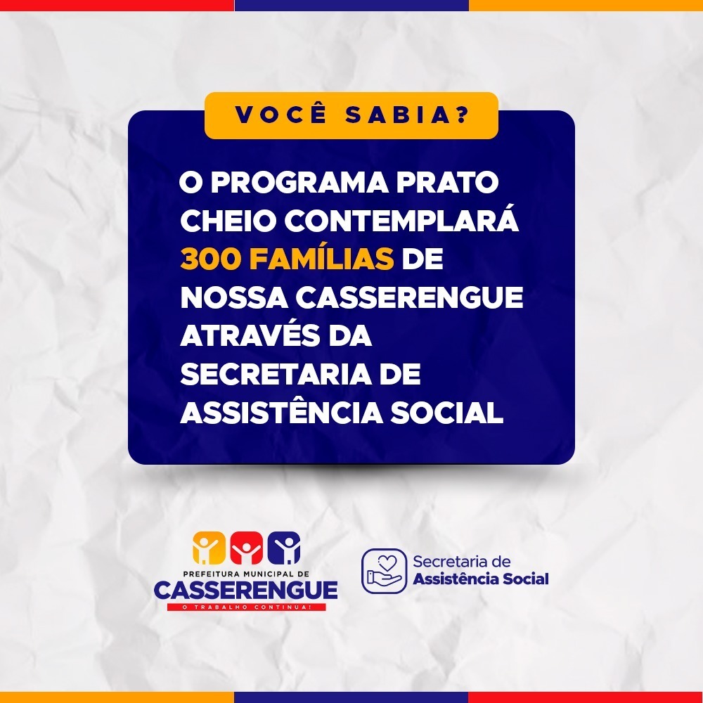 Idealizado pela Prefeitura Municipal de Casserengue através da Secretaria de Assistência Social e em parceria com a Confederação Nacional de Municípios (CNM) e Federação das Associações dos Municípios da Paraíba (FAMUP). O Projeto Prato Cheio chega a nosso município com o objetivo de atender a população vulnerável de nossa cidade.